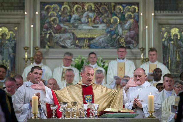 Deacon Dave and Deacon Neil Galloway (RAF) assisting Bishop Paul Mason at his Installation Mass in September 2018. Pictured here with military Chaplains present and past, and the Bishops of England & Wales.